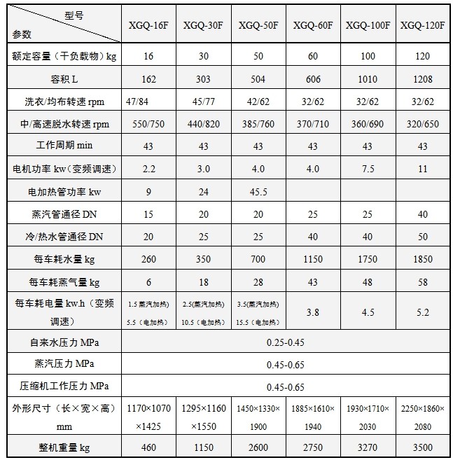 六、洗滌物的投入量: 機器的處理量如下表示,過量的投入會超負荷,縮短機器的使用壽命,另一方面,量過少,機器不易保持平衡,降低洗滌效果,而且浪費能源。 建議: XGQ15F----10-15kg/次 XGQ30F----25-30kg/次 XGQ50F----40-50kg/次 XGQ60F----50-60kg/次 XGQ100F----85-100kg/次 XGQ120F----100-120kg/次